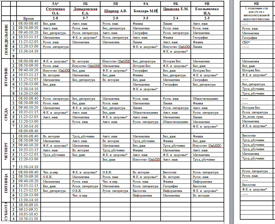Расписание учебных занятий учащихся 5-х, 9-х классов
